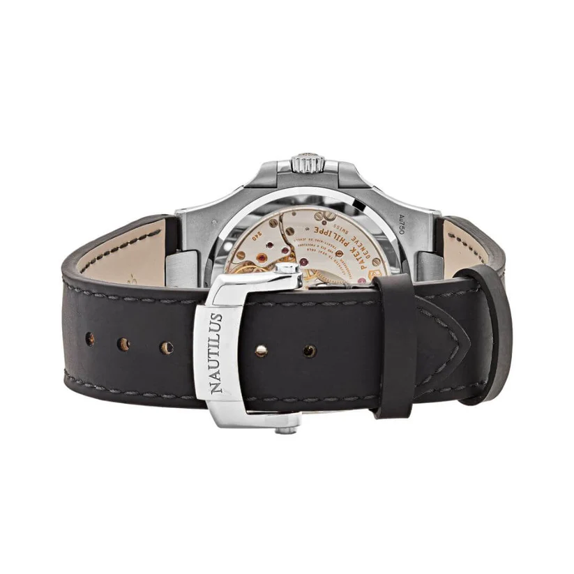 Introducing the Patek Philippe Nautilus 5712G-001 Slate Gray Indices Moon Phase 40mm 18k White Gold Black Matted Leather Straps Men’s Watch. This elegant timepiece combines style and practicality, making it perfect for modern men.